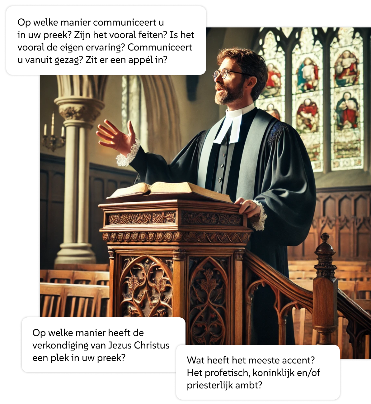 Wij ondersteunen predikanten en voorgangers bij het verfijnen en versterken van hun preken. Met de kracht van kunstmatige intelligentie en bewezen modellen bieden wij diepgaande inzichten en suggesties. Zo kunt u uw boodschap effectiever overbrengen.